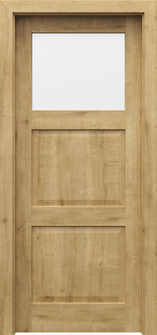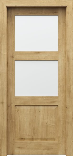 • model B.1. to szczególnie ciekawa propozycja do pomieszczeń, które wymagają dodatkowego doświetlenia, a zatem małych i wąskich pokoi czy salonu. Duża tafla szkła umieszczona między ramiakami zajmuje niemal cały obszar skrzydła. Dzięki temu drzwi nie tylko pozwalają wpuścić do środka więcej światła i optycznie powiększyć przestrzeń, ale dodają wnętrzu przytulności.