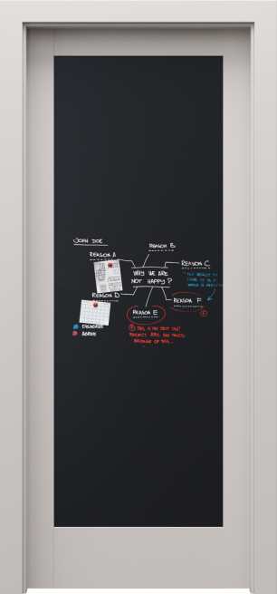 Kolekcja PORTA VERTE HOME grupa E to drzwi ramiakowe pełne lub z fantazyjnym przeszkleniem. W modelu E.0 możliwe jest zamówienie czarnej tablicy magnetycznej do rysowania markerami kredowymi. Tablica dostępna jest tylko z jednej strony skrzydła, z drugiej znajduje się pełna płycina. Ten model dostępny jest jedynie z ościeżnicą przylgową.