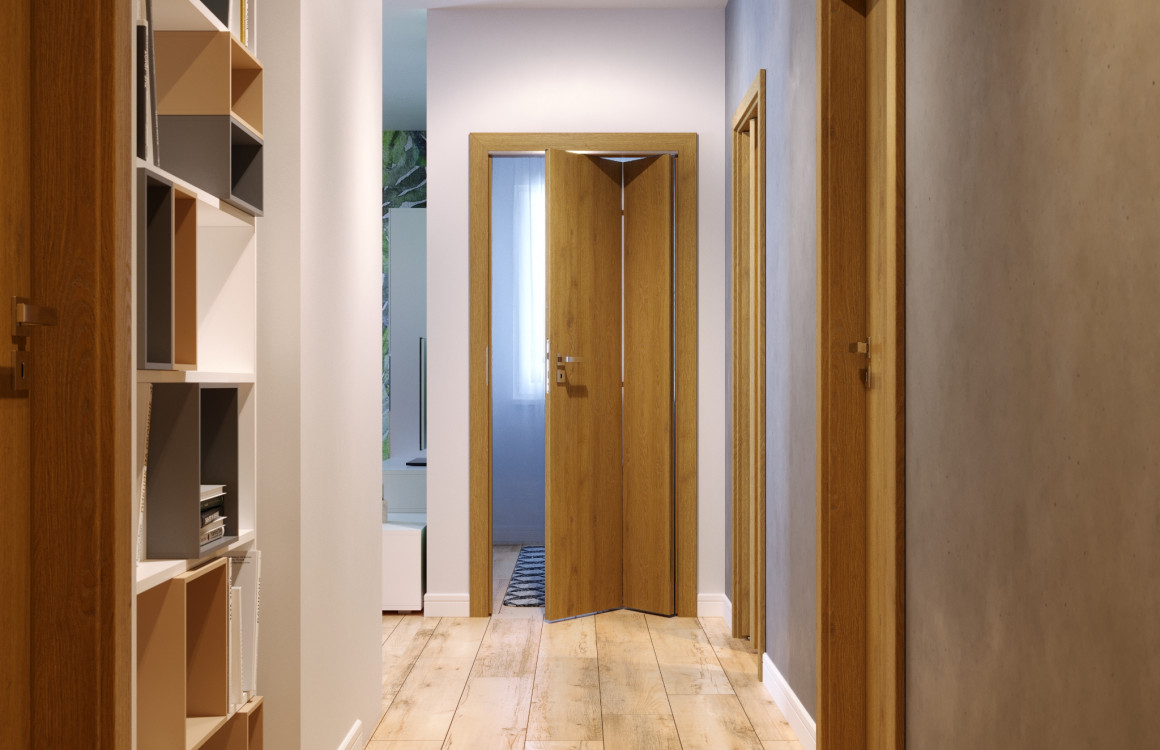 ALFA to drzwi dwuelementowe podzielone asymetrycznie z klasycznym zamkiem w skrzydle i zaczepem w profilu ościeżnicy. Drzwi z tej kolekcji świetnie sprawdzą się jako zamknięcie do garderoby w sypialni, czy schowka pod schodami, i wszędzie tam, gdzie klasycznie otwierane skrzydła kolidowałyby z innymi drzwiami lub meblami. Dostępne są w 40 kolorach oklein, zarówno drewnopodobnych jak i w kolorze białym, popielatym, antracyt, czarnym, a także w jasnym i ciemnym odcieniu betonu.