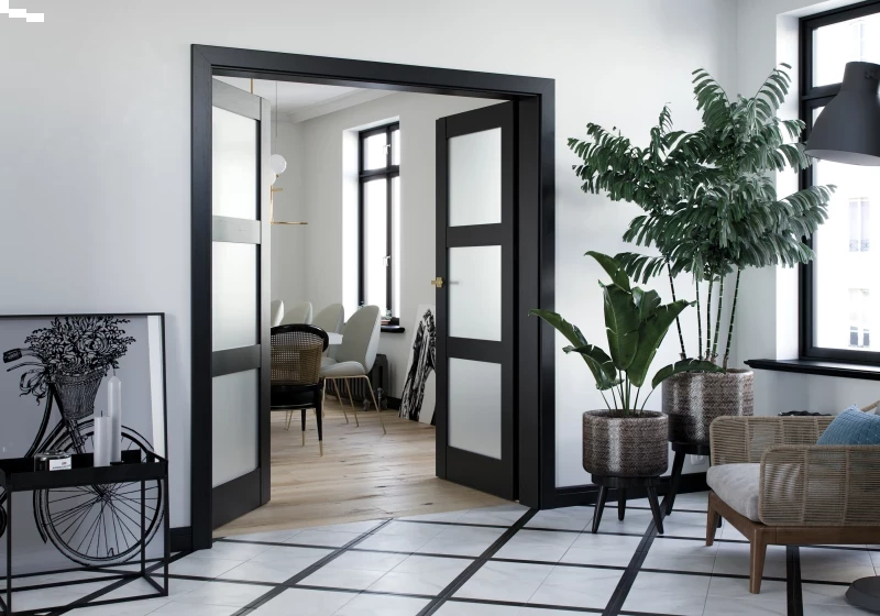 Z kolei warianty, w których zastosowano szybę matową hartowaną, doskonale odnajdują się w pomieszczeniach strefy dziennej oraz w niewielkich mieszkaniach z korytarzem pozbawionym okien.