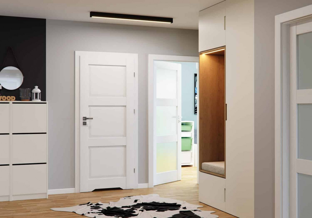 • modele A.0, B.0. oraz D.0. to klasyczne, minimalistyczne drzwi bez przeszkleń, w których zamiast szyb znajdziemy płyciny umieszczone pomiędzy pionowymi i poziomowymi ramiakami. Wszystkie trzy warianty szczególnie dobrze sprawdzą się jako drzwi do toalety, sypialni, pokoju nastolatka czy wejście do domowego gabinetu. Stabilna konstrukcja i brak przeszkleń zapewnią większy poziom izolacji od hałasu oraz poczucie intymności w pomieszczeniach, w których jest to szczególnie istotny aspekt.