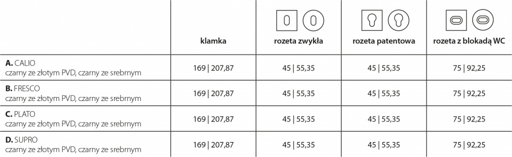 Tabela dostępności rozet dla klamek PORTA PRESTIGE