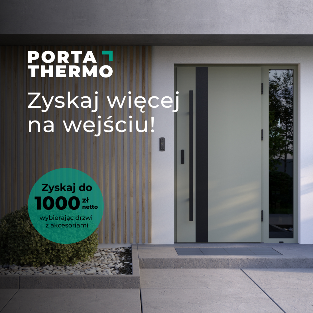 Promocja umożliwia zakup drzwi zewnętrznych PORTA THERMO w specjalnych pakietach OPTIMUM i/lub OPTIMUM ENERGY (z wyłączeniem modeli: R.1-R.6, C.1, C.2, C.4, M.4) wyposażone w pochwyt prostokątny z przyciskiem, klamką Gardo Solo w kolorze Inox, bądź czarnym, elektrozaczep i w przypadku Pakietu Korzyści 1000 zł - samozamykacz ukryty.